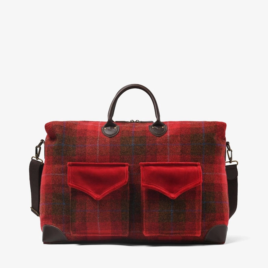 Crafted from fine Harris Tweed fabric in warm shades of red and dark brown, it features a refined check pattern that evokes the atmosphere of adventurous journeys and weekends in nature.