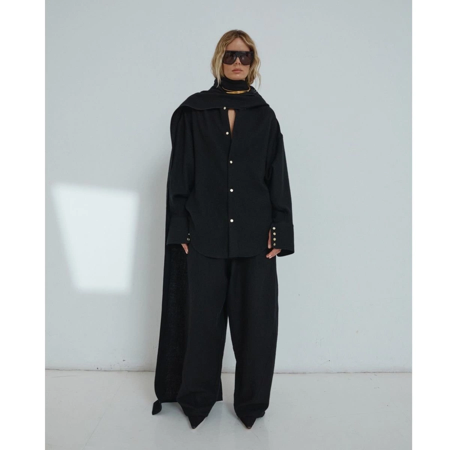 Part of DARKPARK's latest collection, now available, the Georgia and Phebe suit in lightweight Japanese wool embodies one of the brand's most iconic looks. The design is complemented by a removable scarf made from the same fabric as the suit and embellished with refined gold buttons, creating a discreet yet contemporary look.