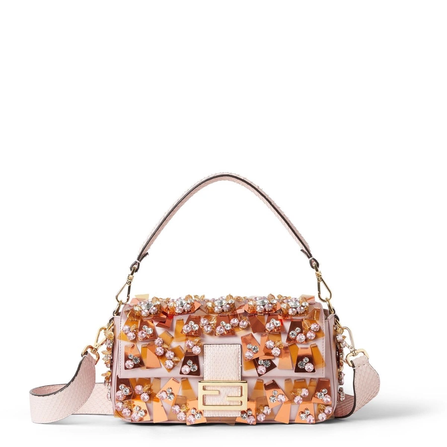 Iconic FENDI Baguette® bag, medium size, made of light pink satin, decorated with a three-dimensional embroidery of sequins, crystals, and mirrored, sculptural-effect appliques in various contrasting shades. Finished in pink elaphe and featuring an FF clasp.