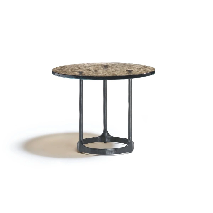 The vibratory finishing technique completes its aesthetic. Using stones, the structure is gently smoothed, creating a wavy effect. The top is made of annealed glass, distinguished, on the underside, by a subtle ripple that adds personality. Here too, the production technique is meticulous: the sheet is placed in a mold with a textured base and fused at a temperature of 180 degrees, giving the glass its distinctive finish. The Aster coffee table is a forged piece with a sculptural appeal, suitable for use across collections and spaces.
