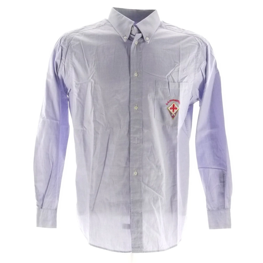 The shirt features a classic, elegant silhouette, with a purple collar and sleeve lining, a distinctive reference to the team. The historic A.C. Fiorentina logo, featuring a red lily with gold trim, is embroidered on the left breast pocket, a timeless symbol of the club's passion for the Viola.