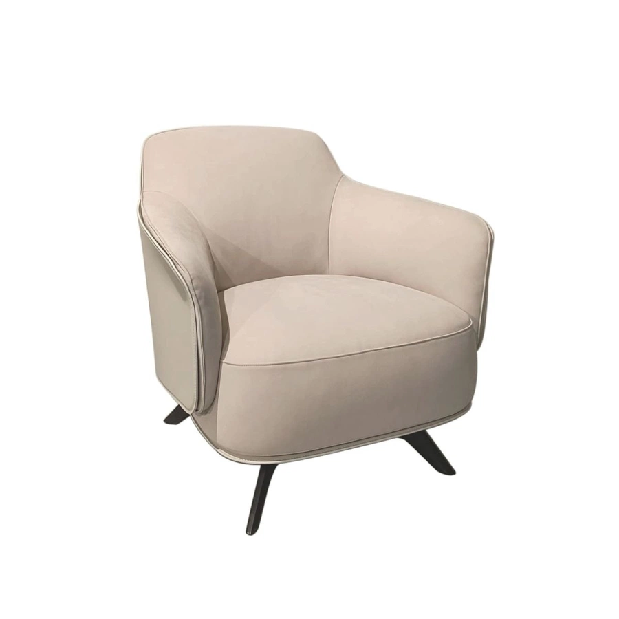 Kaori armchair in milk-colored nubuck leather with a butter-brown leather shell and swivel base.