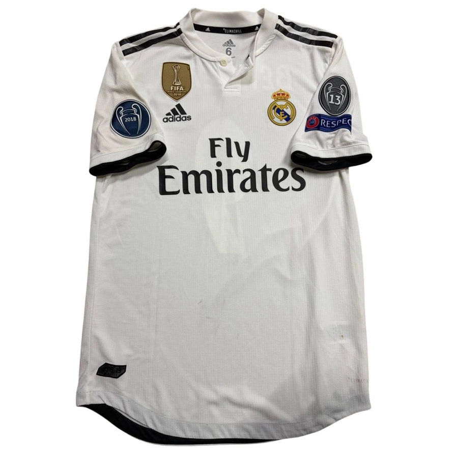 As the shirt features the commemorative FIFA Club World Cup 2018 winners’ patch on the chest, it can be dated with precision. This patch was applied to Real Madrid’s match shirts only after their triumph on 22 December 2018, when Los Blancos defeated Al-Ain. Therefore, the shirt can be attributed exclusively to a match played in the second half of the 2018/19 season, from January 2019 onwards.