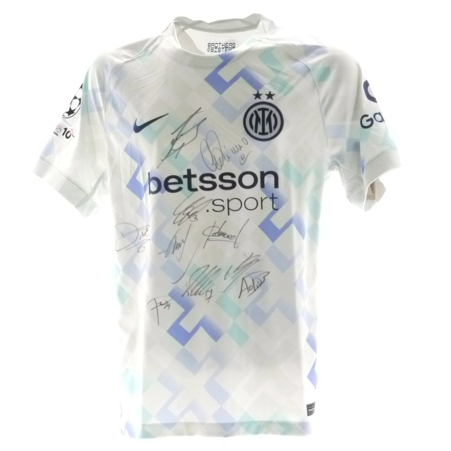The shirt has been signed by Chivu, Kolarov, De Vrij, Zielinski, Diouf, Frattesi, Zanetti, Pio Esposito, Sommer, Adriano