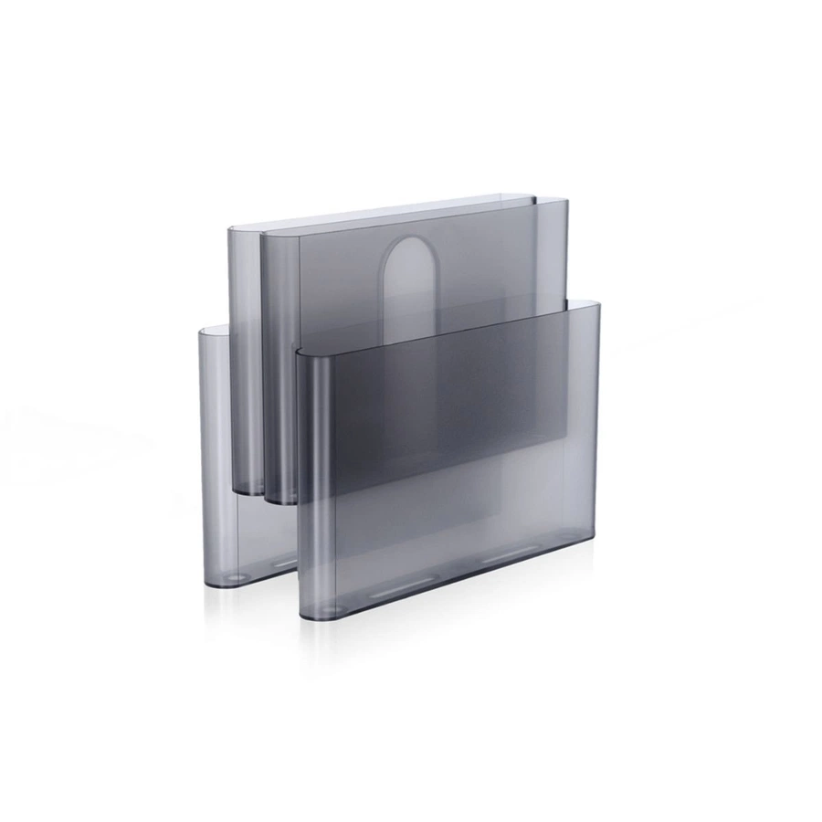 A four-pocket magazine rack with a central handle for easy grip. Its simple yet decidedly practical shape makes it an easy addition to any space.