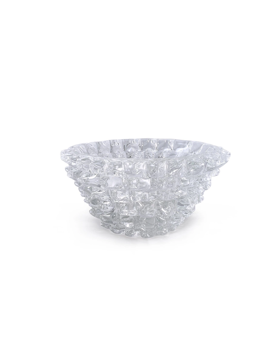 This bowl embodies the pinnacle of Murano glassmaking, blending tradition and innovation in a single, extraordinary work. Born from an idea by Ercole Barovier in the 1940s and crafted using the revolutionary "rostrato" technique, patented by Barovier & Toso in the 1930s, this vase is distinguished by its richly textured surface. This meticulous craftsmanship requires great skill. The transparency of the glass gives the bowl an extraordinary shine and a unique visual effect.