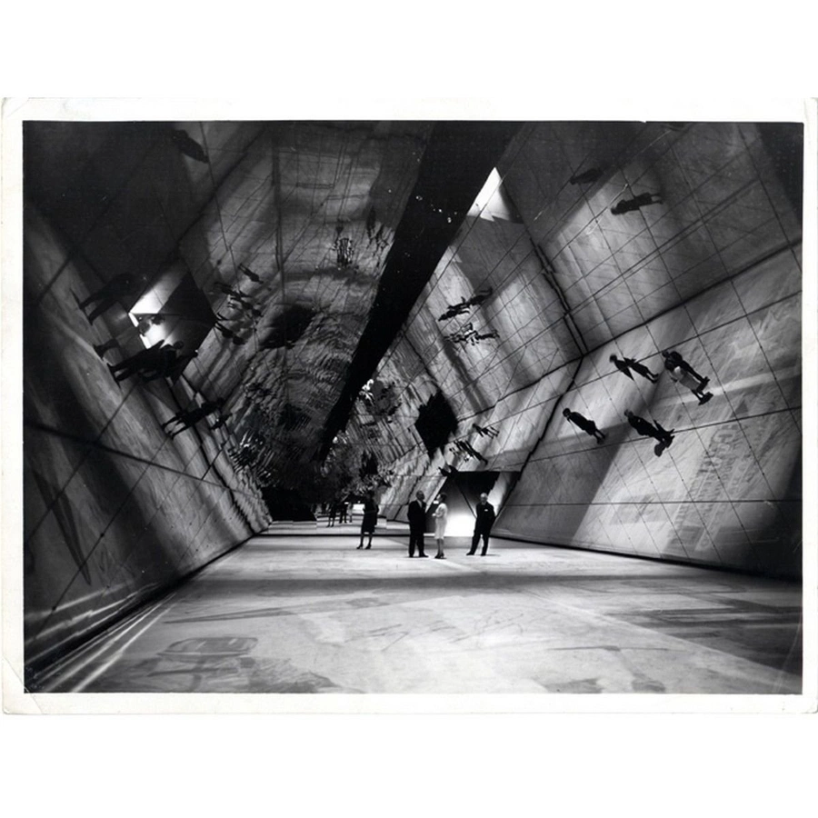 On the white floor of the hall, two films directed by Tinto Brass were projected and simultaneously reflected six times in the mirrors. One film focused on leisure time, the other on working time. The 9-minute films were composed of collages of archival footage. A special editing technique allowed, on one hand, for the two themes to be rhythmically synchronized, and on the other, for multiple episodes to unfold simultaneously within the same film, resulting in a complex series of transitions and intersections between different moments of the narrative.