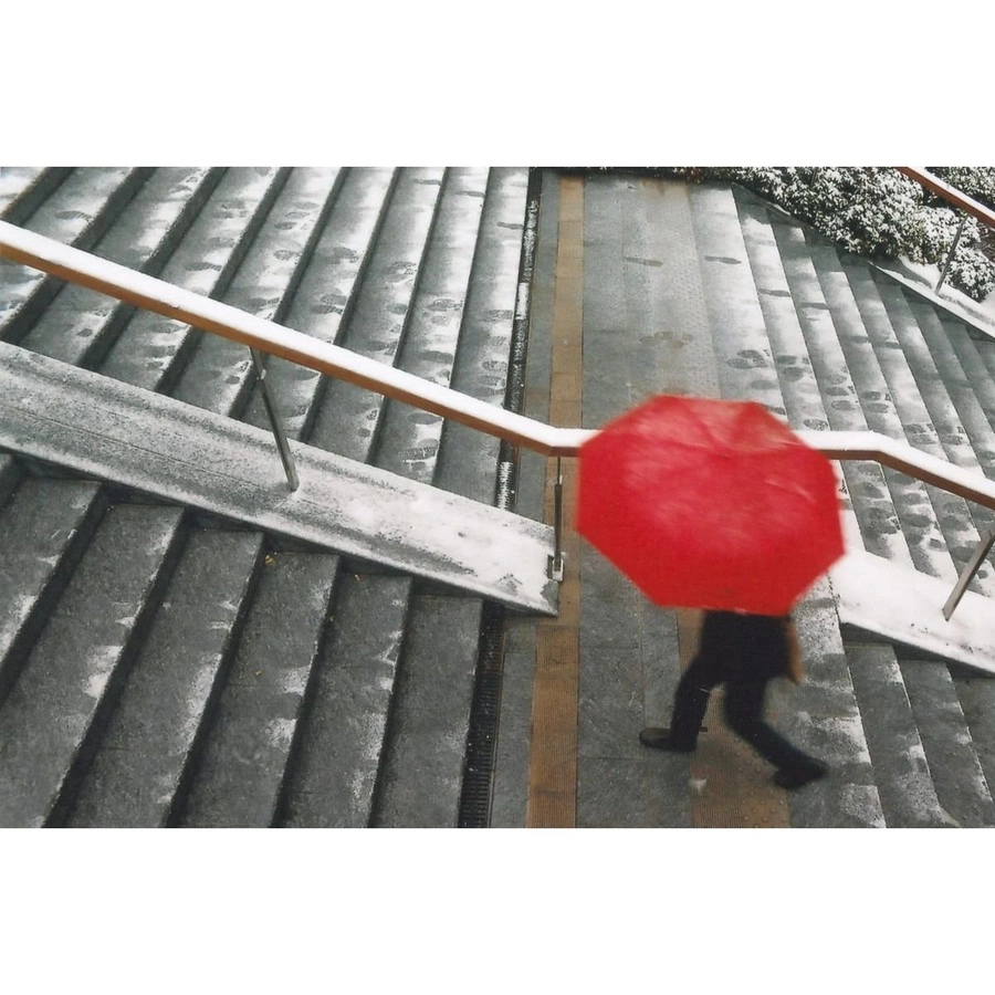 Unfortunately, it snows less and less in Milan these days. That day, braving the cold and snow, I ventured among the skyscrapers of Porta Nuova and happened to see a person with a red umbrella heading toward the steps. So I approached the parapet, and when he was below me, I took the shot.