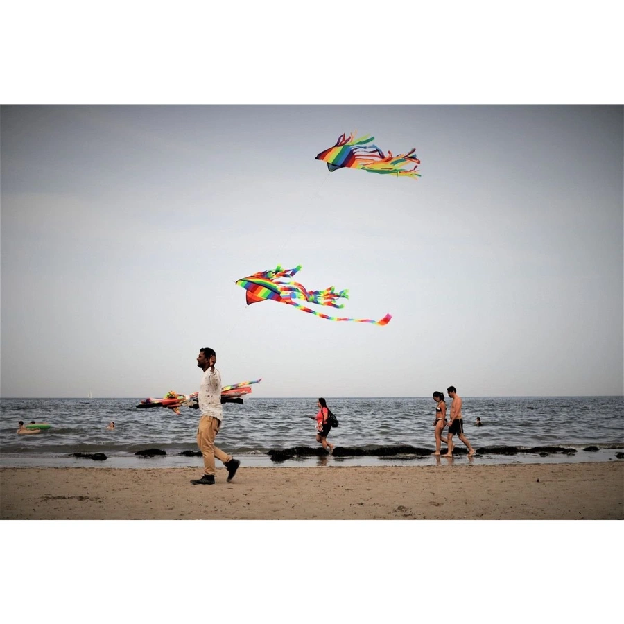 I was on a quiet beach around five in the afternoon in June, intending to capture something special, when suddenly a man appeared, towing two kites. I was lying down, but I had my camera ready, and the shot was taken immediately. I was immediately satisfied and happy with this image, which, in my opinion, conveys a great deal of joy and is also very natural. That afternoon, I couldn't have asked for anything better.