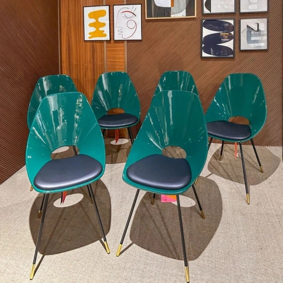 6 chairs in curved plywood with glossy lacquer in Dimorestudio green, fixed cushion in black leather.