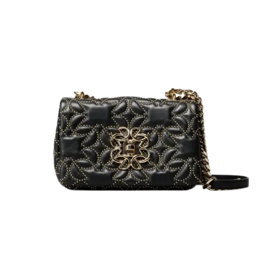 Studded Black Leather Bag embellished with the ELIE SAAB monogram and a metallic chain.