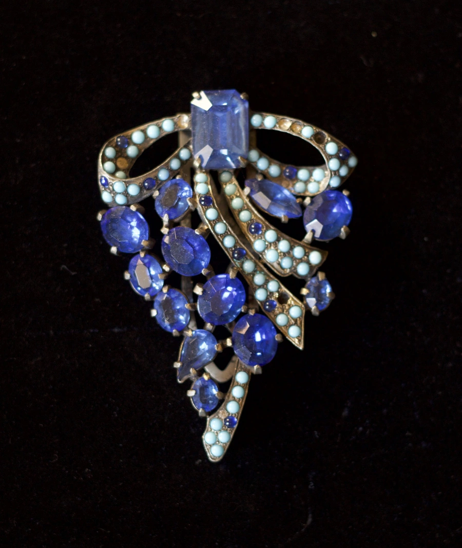 Grande spilla a clip in lega d’argento con strass blu e pasta di vetro turchese – USA, circa 1940