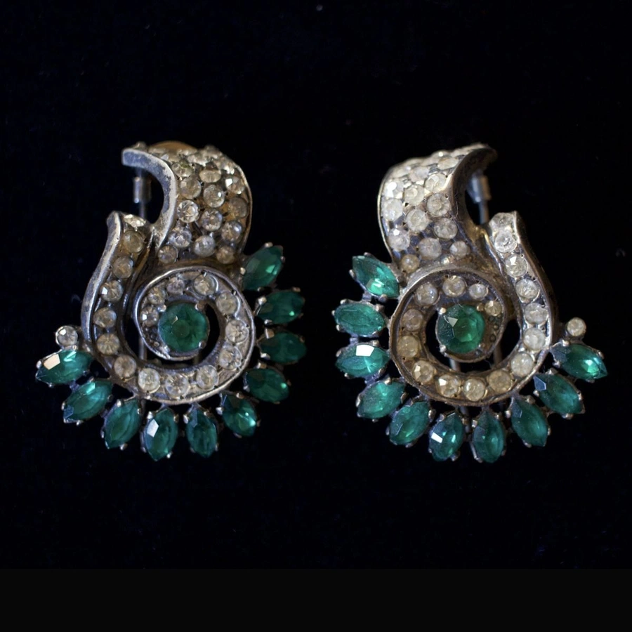 Questa delicata coppia di spille a clip, realizzata in lega d’argento e datata intorno agli anni ’40, rappresenta un piccolo gioiello di eleganza vintage firmato Eisenberg Original.