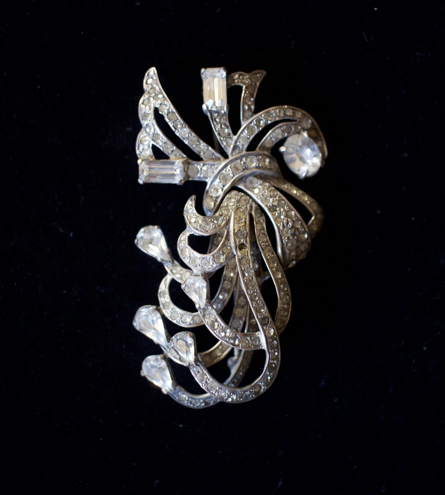 Questa elegante spilla a forma di fiocco, realizzata in lega di argento e datata intorno al 1945, è un esempio raffinato della bigiotteria americana d’epoca, caratterizzata da un gusto sobrio e delicato.