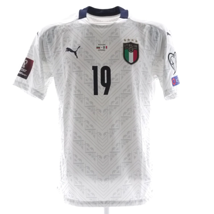 In asta la maglia gara dell'Italia preparata / indossata da Bonucci in occasione della partita di qualificazione ai mondiali contro la Bulgaria, giocata in data 28/03/2021, stagione 2020/21.
