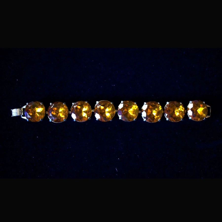 Questo bracciale con strass color ambra, realizzato in Italia intorno agli anni ’60, è un affascinante esempio di gioiello da teatro, pensato per impreziosire il polso con luce, calore e intensità scenica.