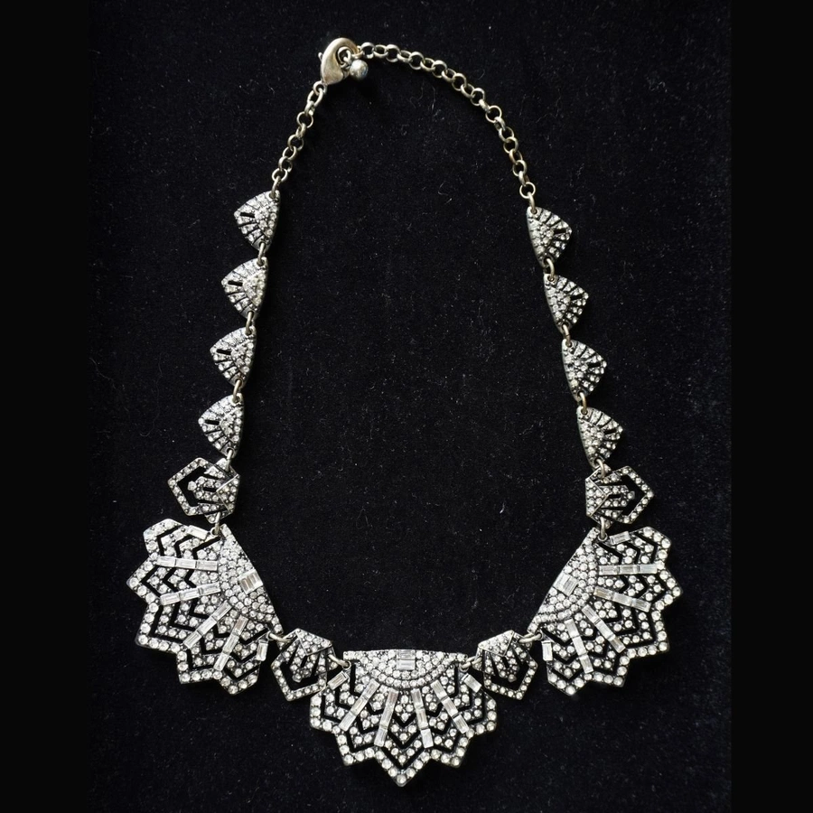Con una lunghezza di 49 cm e una larghezza massima di 4 cm, la collana si sviluppa in una struttura riccamente decorata, ispirata alle linee geometriche e simmetriche tipiche dello stile Art Déco. Gli strass bianchi, sapientemente disposti, creano un effetto luminoso e raffinato, perfetto per catturare la luce dei riflettori e amplificare l’espressività dell’interprete sul palcoscenico.