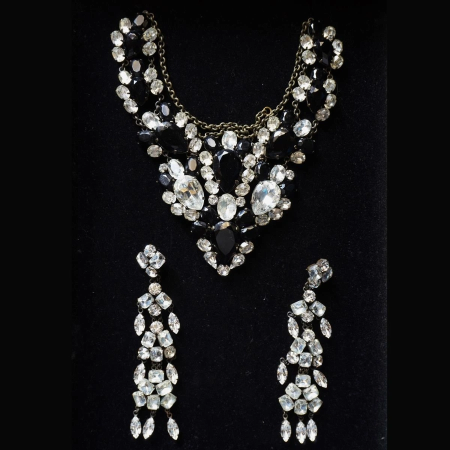Questa parure di forte impatto visivo, realizzata in Italia intorno agli anni ’90, è composta da una collana importante e da lunghi orecchini pendenti con foro, ed è un perfetto esempio di gioielleria da teatro pensata per stupire con contrasti decisi, brillantezza e presenza scenica.