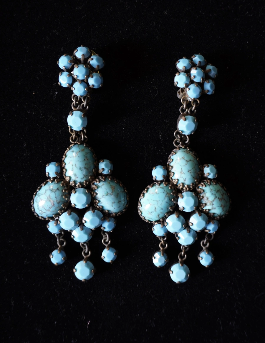 Questi orecchini pendenti a clips, realizzati in Italia intorno agli anni ’90, colpiscono per la loro raffinata eleganza e il vivace colore turchese. Le pietre in pasta di vetro turchese, incastonate in una montatura in metallo brunito, creano un affascinante contrasto di tonalità e materiali che richiama il gusto rétro della bigiotteria d’autore italiana.