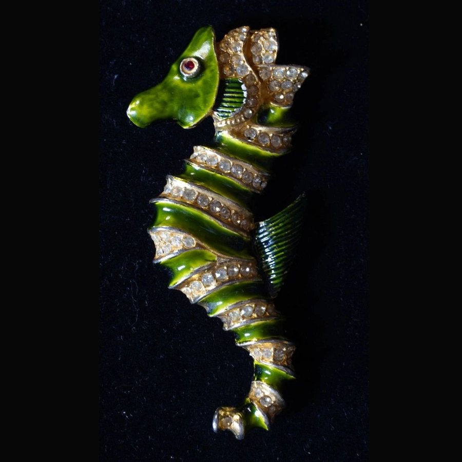 Questa grande spilla in vermeil a forma di cavalluccio marino, realizzata negli Stati Uniti intorno agli anni ’50, è un magnifico esempio di gioielleria fantasia di metà secolo. Il corpo del cavalluccio è modellato con eleganza e decorato da una lacca verde brillante, che ne sottolinea la forma sinuosa e vivace, mentre piccoli strass bianchi impreziosiscono la superficie aggiungendo punti di luce e raffinatezza.