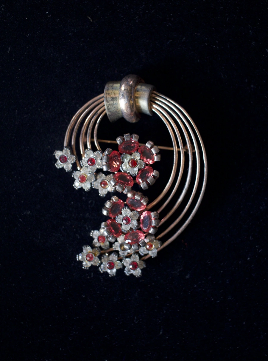 Questa grande spilla in vermeil di Pennino, realizzata negli Stati Uniti intorno agli anni ’40, è impreziosita da una cascata di strass rossi e bianchi che creano un elegante gioco di luci e colori. La montatura in argento dorato conferisce calore e profondità all’insieme, mentre la combinazione di pietre dona un effetto sofisticato e vivace.