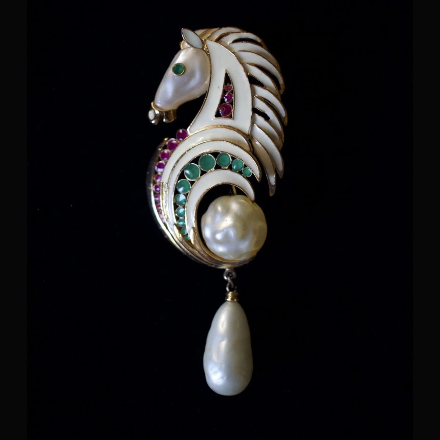 Con dimensioni di 7 cm x 4 cm, questa spilla unisce design giocoso e sofisticato, rappresentando un esempio significativo della bigiotteria americana d’epoca di alta qualità.