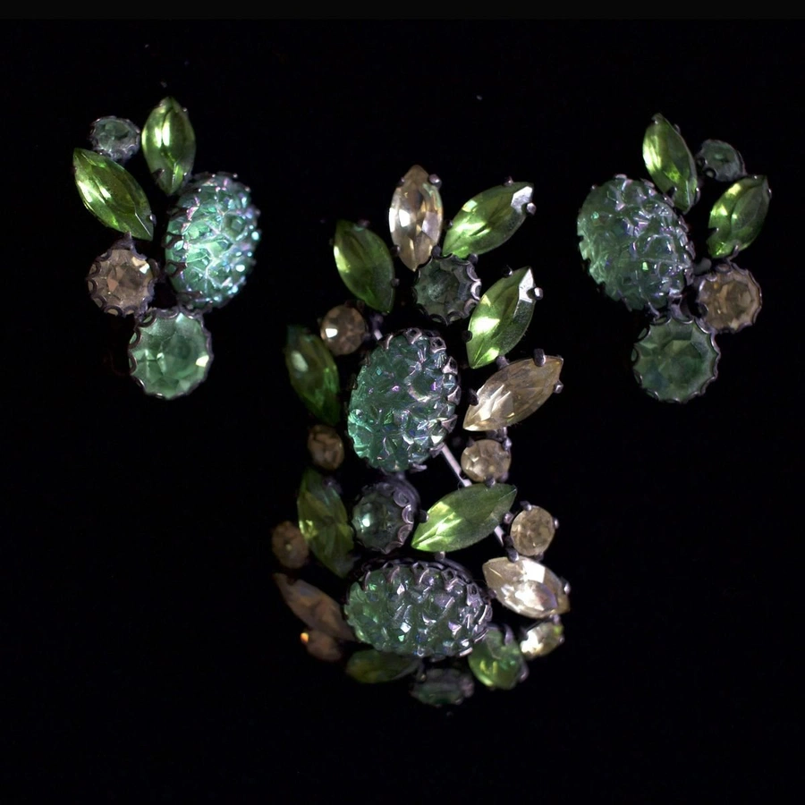 Questa affascinante parure, firmata Elsa Schiaparelli e realizzata negli Stati Uniti intorno agli anni ’50, è composta da una spilla e un paio di orecchini a clip impreziositi da paste di vetro lavorate con la tecnica “lava” di colore verde. Questa particolare lavorazione dona ai pezzi una texture unica e irregolare, che ricorda le superfici vulcaniche, conferendo un aspetto organico e dinamico alla parure.
