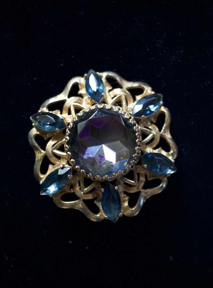 Questa splendida spilla, firmata Elsa Schiaparelli e realizzata negli Stati Uniti intorno agli anni ’50, è decorata con strass dal suggestivo effetto cangiante “aurora boreale”, che riflettono una gamma di colori delicati e mutevoli a seconda della luce e dell’angolazione.