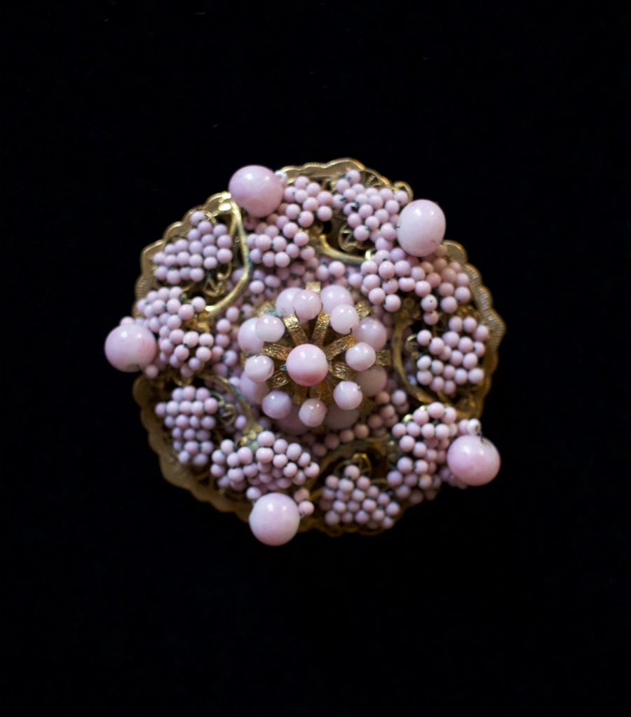 Questa raffinata spilla firmata Miriam Haskell, realizzata negli Stati Uniti intorno agli anni ’40, è un autentico esempio di maestria artigianale. La lavorazione a filigrana delicatamente intrecciata crea un elegante intreccio metallico, arricchito da piccole perline rosa che donano al gioiello un tocco di dolcezza e femminilità.