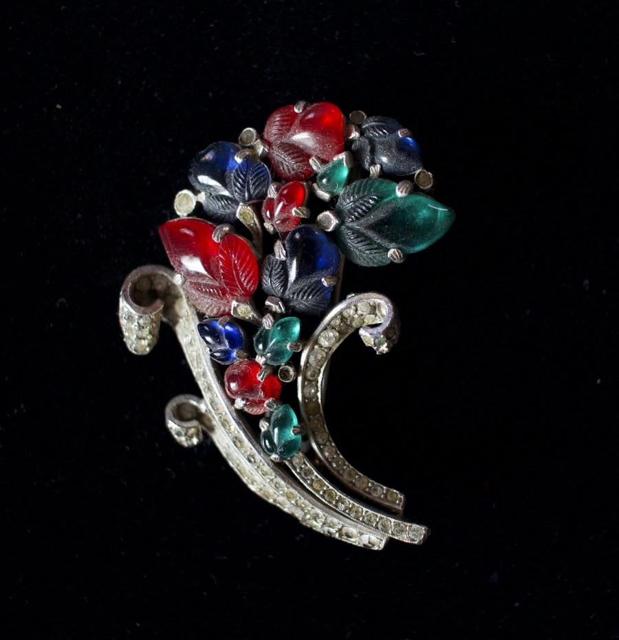Questa vivace e originale spilla, parte della celebre serie “Fruit Salad”, è stata progettata dal famoso designer Alfred Philippe per Trifari negli Stati Uniti intorno agli anni ’40. Il gioiello è caratterizzato da un’esplosione di strass multicolori, che evocano la freschezza e l’allegria di una macedonia di frutta, con sfumature brillanti e gioiose.