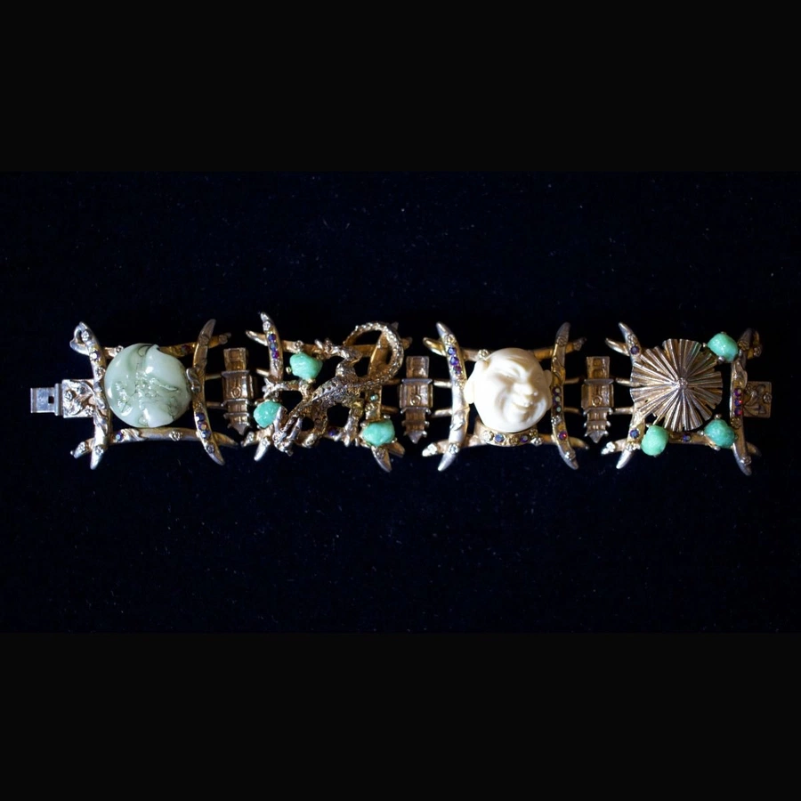 Realizzato in metallo dorato, il bracciale presenta una composizione ricca e scenografica, decorata con figure di Buddha, dragoni e elementi ornamentali orientali che si intrecciano in un disegno dinamico e ricercato. I dettagli sono esaltati da smalti colorati e strass luminosi, che donano al gioiello profondità e vivacità cromatica.