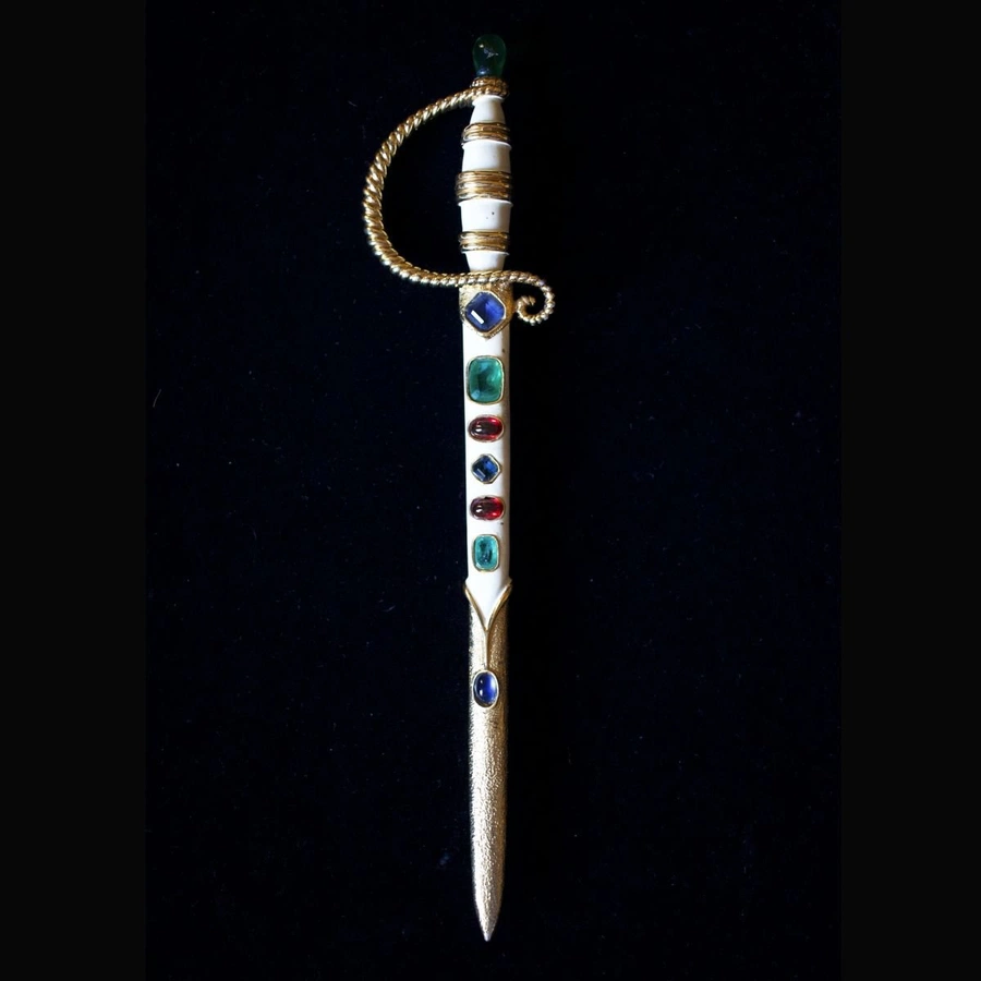 A forma di pugnale, il gioiello combina lacca nera e strass di diversi colori, creando un effetto visivo dinamico e luminoso. La lama e l’impugnatura, finemente dettagliate, catturano la luce con giochi di riflessi, mentre la lacca scura aggiunge profondità e drammaticità alla composizione.