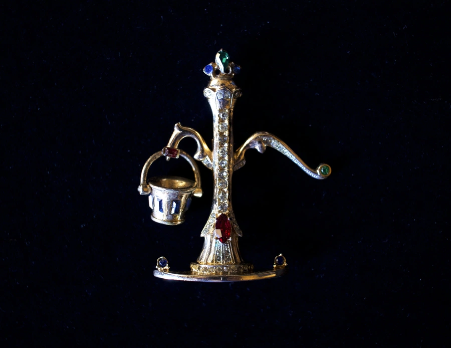 La spilla, a forma di fontana con secchiello, combina argento e strass di diversi colori, creando un effetto allegro e luminoso. I piccoli cristalli, applicati con precisione, decorano sia la struttura della fontana sia il secchiello, aggiungendo bagliori vivaci e rendendo il gioiello brillante da ogni angolazione.