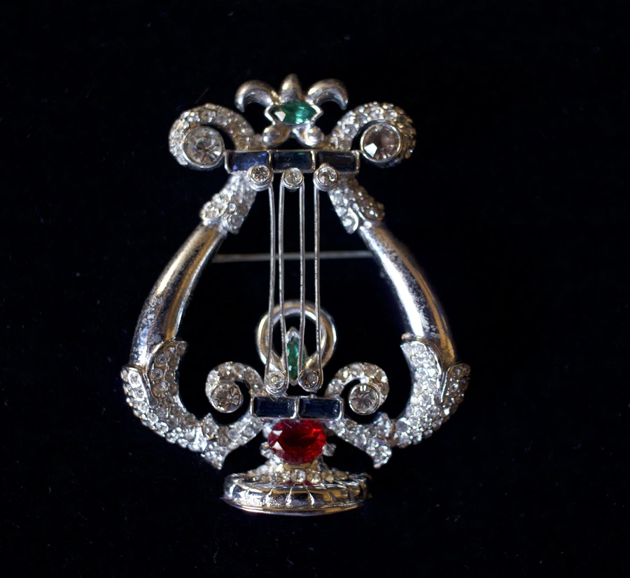 Il gioiello, a forma di lira, è arricchito da strass di vari colori che catturano la luce e conferiscono brillantezza al design. La struttura in argento è finemente modellata, mentre i cristalli aggiungono vivacità e armonia, trasformando lo strumento musicale in un piccolo capolavoro da indossare.