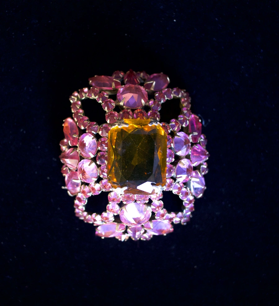 La spilla è decorata con un grande strass citrino, affiancato da strass rosa, che creano un elegante contrasto di colori e una brillantezza raffinata. La lavorazione accurata e la disposizione armoniosa dei cristalli mettono in risalto il design, trasformando il gioiello in un accessorio scenografico e di grande impatto visivo.