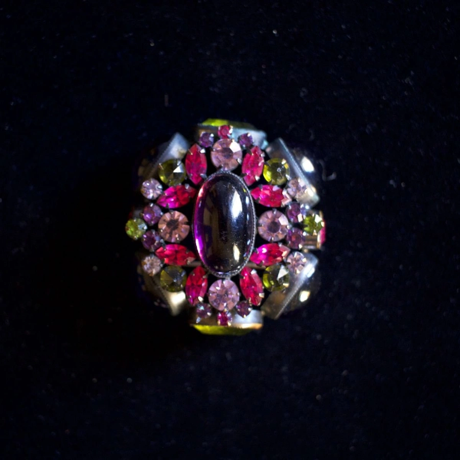 La spilla, di dimensioni 5 cm x 4,5 cm, presenta una struttura bombata che ne accentua la tridimensionalità e la brillantezza. È impreziosita da una ricca composizione di strass nei toni dell’ametista e del citrino, sapientemente accostati per creare un affascinante contrasto tra i riflessi violacei e dorati delle pietre.