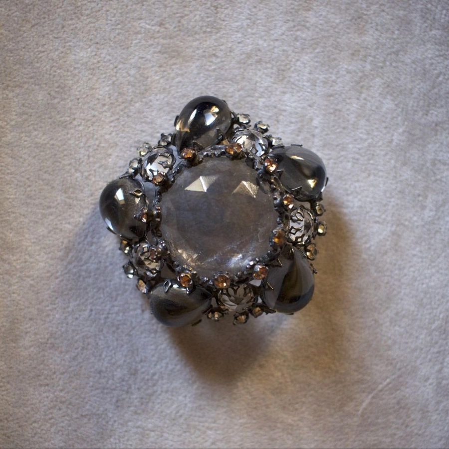 La spilla, di dimensioni 5,7 cm x 5,7 cm, presenta una forma bombata e armoniosa, tipica dello stile Schreiner, che dona profondità e movimento all’insieme. È interamente decorata con strass nei toni del grigio e del bianco, accostati con grande equilibrio per creare un effetto di luce sofisticato e cangiante.