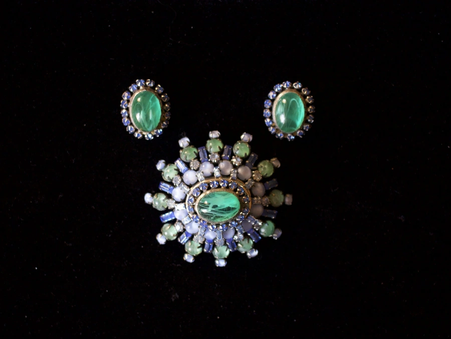 Magnifica parure composta da spilla a cupola e orecchini a clip, firmata Schreiner e realizzata negli Stati Uniti intorno agli anni Cinquanta, esempio superbo dell’eleganza e della qualità artigianale che hanno reso celebre la maison newyorkese.