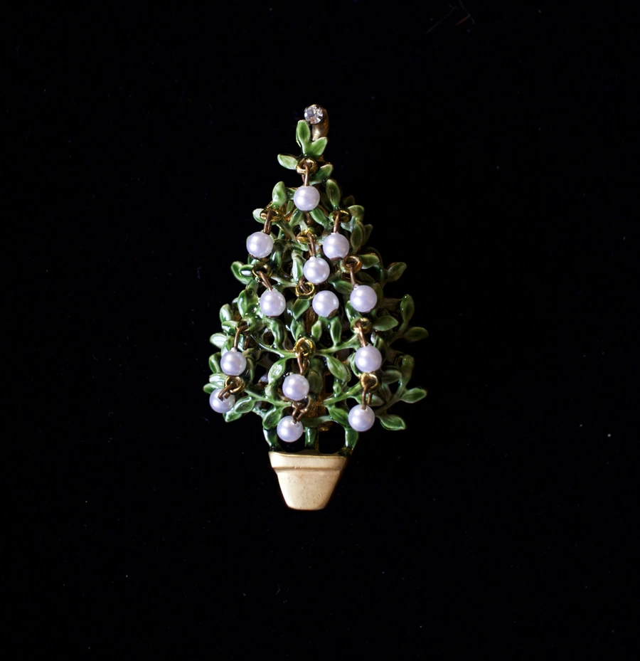 Incantevole spilla natalizia a forma di alberello, realizzata negli Stati Uniti intorno agli anni Sessanta dalla maison Robert, celebre per la sua bigiotteria di qualità e dal design distintivo.