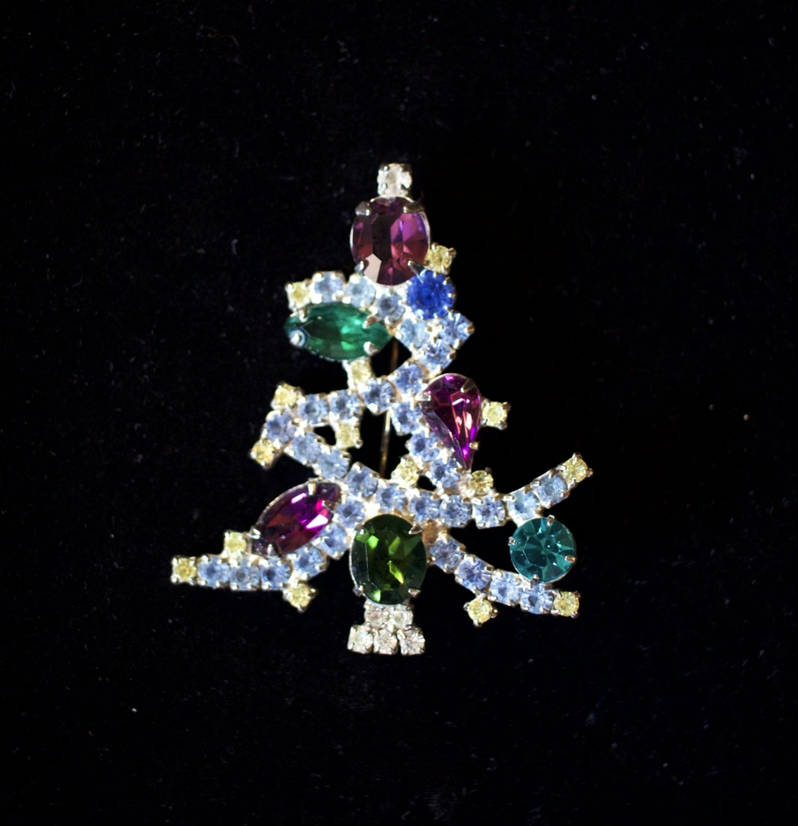 Vivace spilla natalizia a forma di alberello, realizzata negli Stati Uniti intorno agli anni Sessanta dalla celebre maison Juliana, rinomata per le sue creazioni colorate e scenografiche.