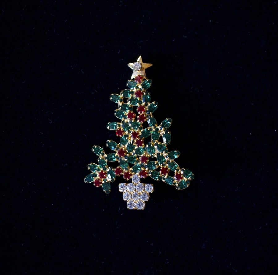 Splendida spilla natalizia a forma di alberello, realizzata negli Stati Uniti intorno agli anni Sessanta dalla prestigiosa maison Eisenberg Ice, celebre per la sua bigiotteria raffinata e dai dettagli scenografici.