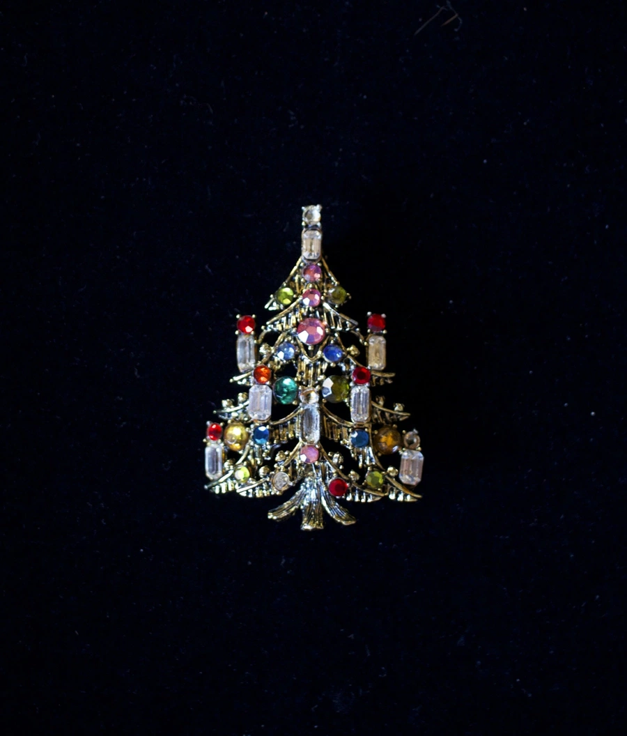 Incantevole spilla natalizia a forma di alberello, realizzata negli Stati Uniti intorno agli anni Settanta e documentata nel volume “Strass” di Rizzoli a cura di Hollycraft.