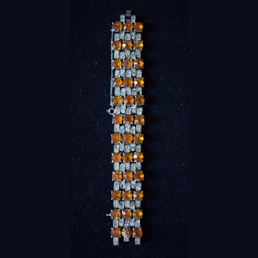 Il bracciale a tre file di strass bianchi e arancio è un raffinato esempio di bigiotteria americana degli anni Trenta, realizzato intorno al 1935 dalla celebre casa Staret, nota per le sue creazioni di alta qualità e per l’uso innovativo dei cristalli colorati.