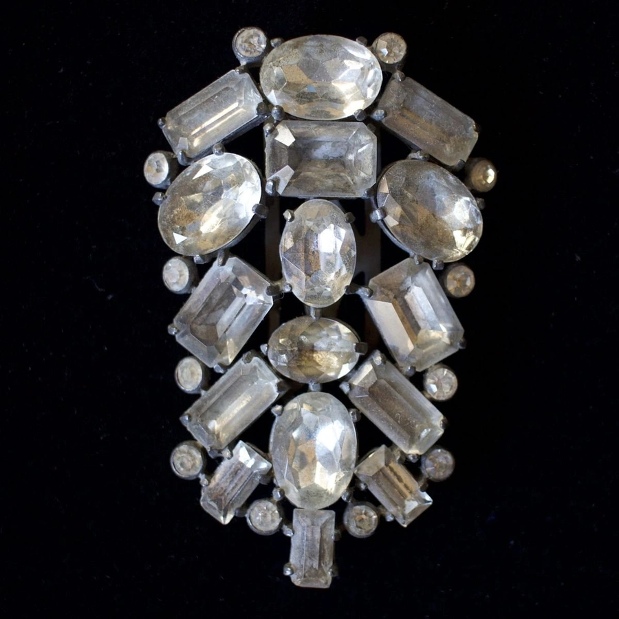 La spilla, dalle dimensioni di circa 8,5 x 5,5 cm, si distingue per la sua composizione geometrica e bilanciata, tipicamente déco, con volumi definiti e simmetrie eleganti. È ornata da grandi strass bianchi sfaccettati, che catturano la luce con straordinaria intensità, conferendo al gioiello un effetto di brillantezza sofisticata e scenografica.