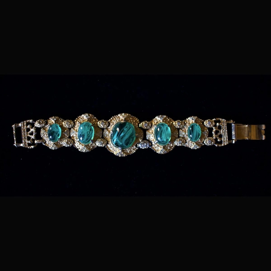 Il bracciale, in vermeil (argento dorato), è composto da cinque maglie di forma ovale, ciascuna impreziosita da un grande strass color smeraldo, montato per esaltarne la brillantezza e il fascino cromatico. La struttura a maglie conferisce al gioiello movimento e flessibilità, rendendolo elegante e confortevole da indossare.