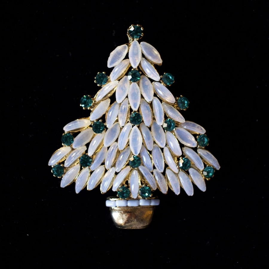 Il corpo dell’alberello è impreziosito da strass di colore opale, che donano una luce calda e iridescente, mentre i piccoli strass verdi richiamano il tipico colore degli aghi del pino, creando un contrasto elegante e festoso. La lavorazione, tipica della maison Weiss, mette in evidenza l’attenzione ai dettagli e la qualità artigianale, rendendo questo pezzo non solo un accessorio gioioso per le feste, ma anche un piccolo oggetto da collezione.