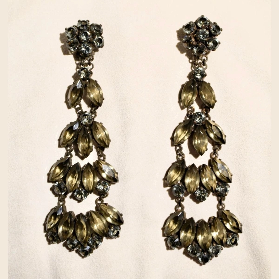 Questi lunghi orecchini pendenti a clips rappresentano un esempio elegante della produzione italiana di gioielli da teatro degli anni ’90. Misurano 10 cm x 4 cm e si distinguono per la loro linea slanciata e scenografica, perfetta per catturare l’attenzione.