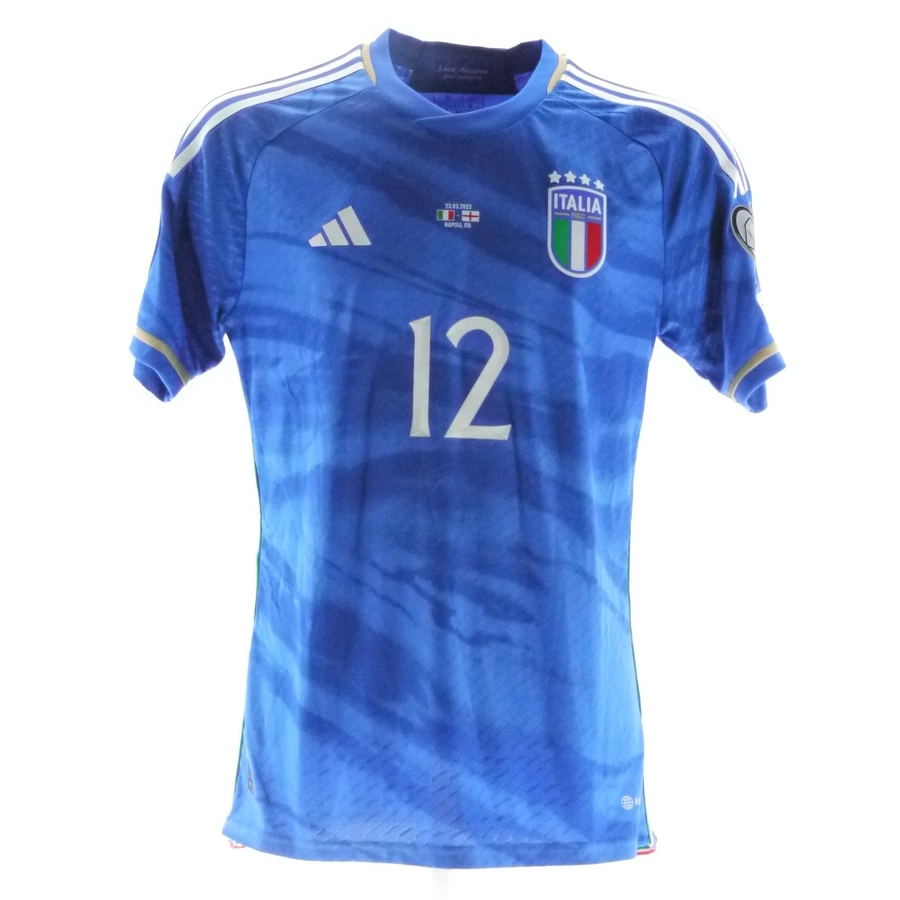 Maglia gara dell'Italia preparata / indossata da Pessina nella partita contro l'Inghilterra giocata a Napoli il 23/03/2023, valida per le qualificazioni a Euro2024, stagione 2022/23.