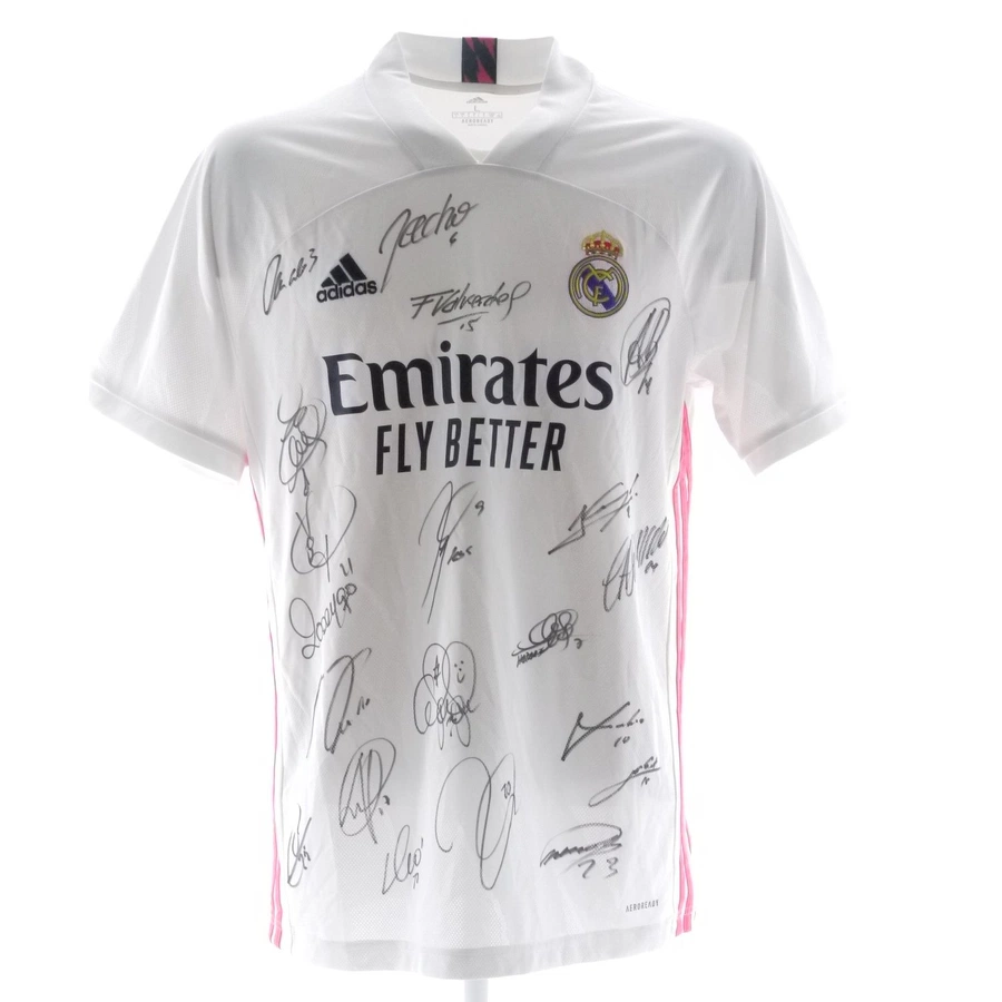 The shirt was signed by Real Madrid players from that season, including: Karim Benzema, Ferland Mendy, Nacho Fernandez, E. Hazard, Vinicius Jr, Rodrygo, Courtois, Modric, Casemiro, Kroos, Camavinga, Isco, Valverde, Marcelo, Jovic, Alaba, Militao, Carvajal, M. Asensio, Vázquez.