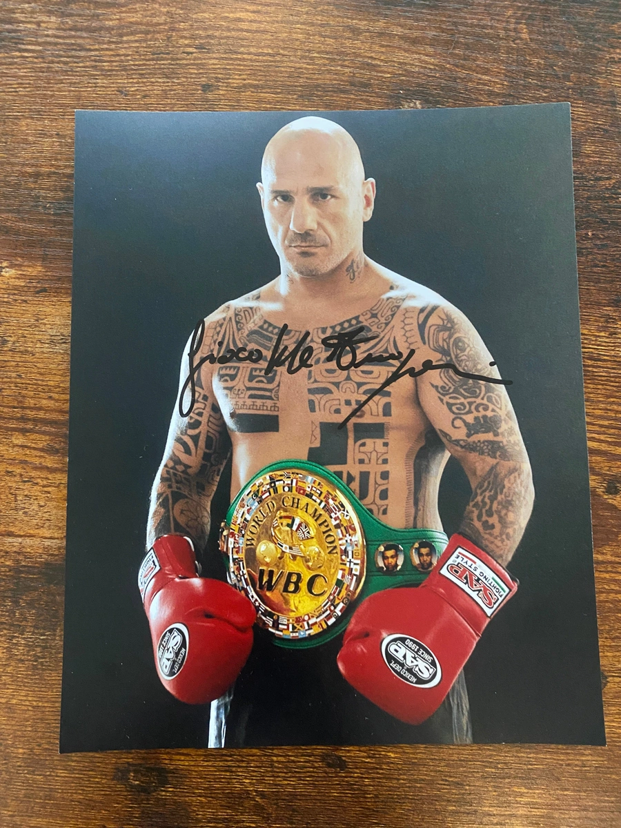 Questa fotografia autografata celebra uno dei protagonisti assoluti della boxe italiana contemporanea: Giacobbe Fragomeni, il pugile milanese che ha scritto pagine importanti nella storia del pugilato mondiale.